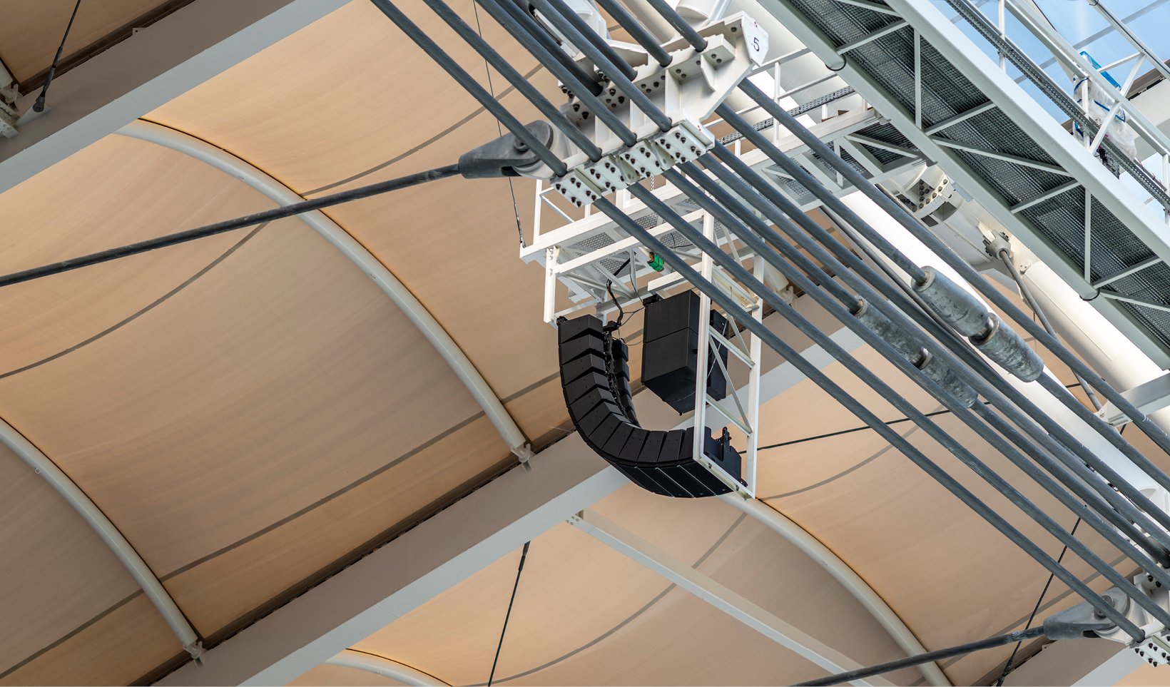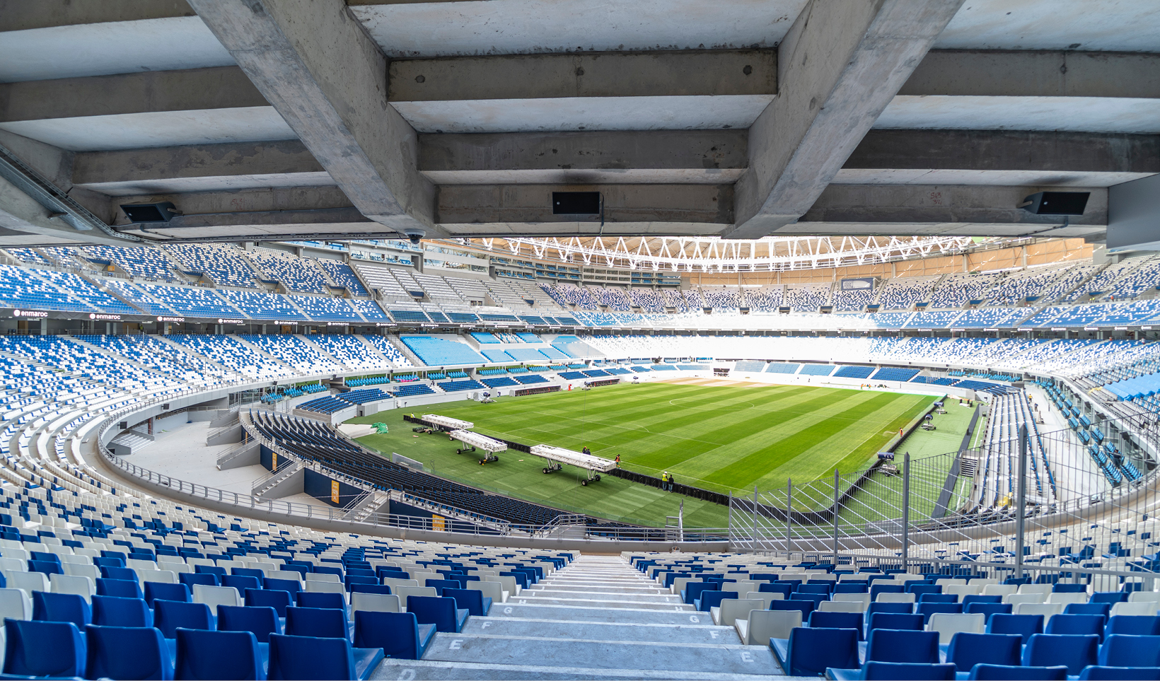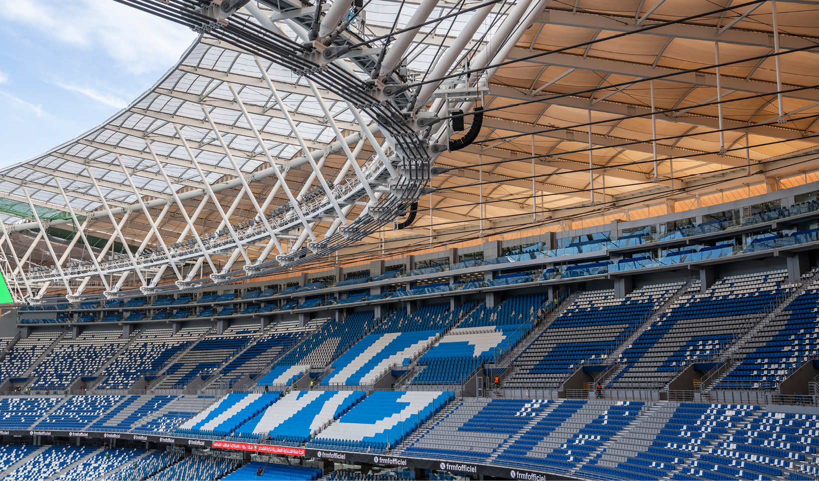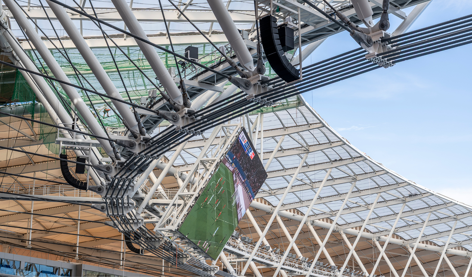 „Rozpięta konstrukcja dachu stadionu przypomina tę zastosowaną na Maracanã w Rio de Janeiro. Wąski pomost techniczny pod zadaszeniem stwarzał istotne ograniczenia montażowe i dostępowe, wymagając rozwiązania dostosowanego do stałych punktów podwieszenia oraz skróconego harmonogramu realizacji” — kontynuuje Mediouni. „Nasi koledzy z RCF Engineering Support Group zapewnili wsparcie w zakresie projektu systemu i jego uruchomienia, w tym weryfikację akustyczną przy użyciu kalibrowanej aparatury pomiarowej oraz metod oceny zrozumiałości mowy zgodnych z normami IEC.”