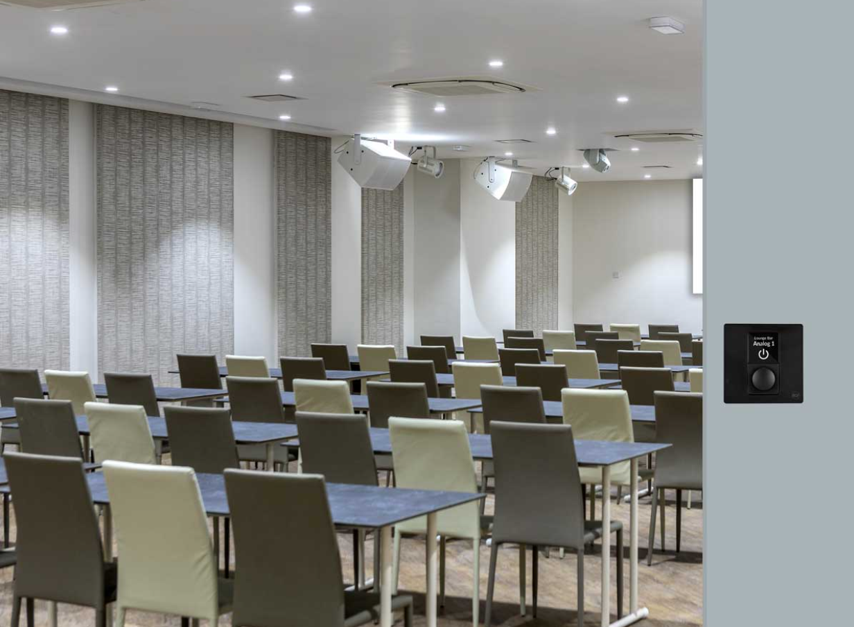 RC KPS to naścienny, sieciowy kontroler z zasilaniem PoE, przeznaczony do wzmacniaczy RCF KPS, umożliwiający wybór źródła sygnału oraz regulację głośności. Minimalistyczna konstrukcja wykonana jest z wysokiej jakości polimeru o matowym, przyjaznym w dotyku wykończeniu, z ukrytymi śrubami montażowymi. Urządzenie oferuje jasny i ciemny schemat wyświetlacza, regulację jasności oraz opcje podświetlenia przycisków, a także obsługuje szybkie parowanie sieciowe i konfigurację poprzez oprogramowanie RDSpace.