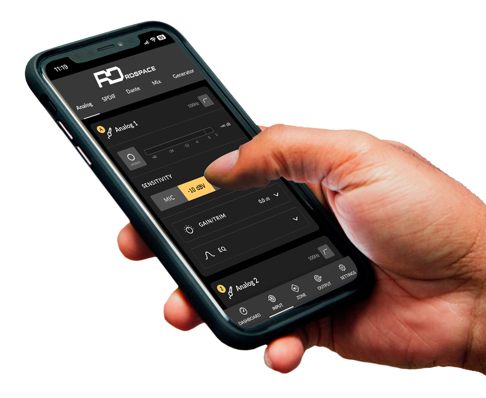 RDSpace umożliwia zarządzanie filtracją FIR o liniowej fazie, presetami głośników i presetami użytkownika, elastycznym routowaniem sygnału, korekcją parametryczną EQ, precyzyjnym opóźnieniem oraz pełną kontrolą urządzeń. Cała konfiguracja i monitoring odbywają się w jednej aplikacji, z wykorzystaniem spójnego interfejsu, zapewniając operatorowi pełną kontrolę nad całym systemem audio z każdego poziomu dostępu.